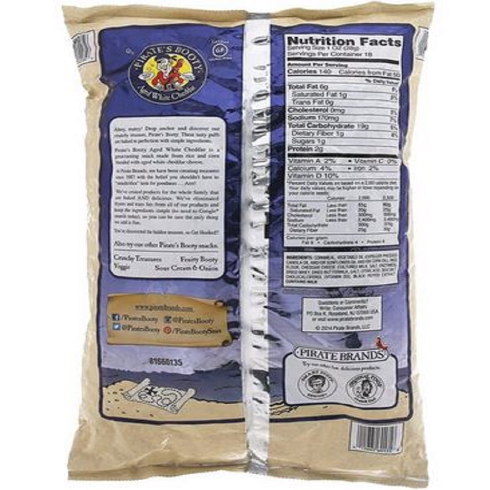 Mom blows whistle on 'booty' snack / Rice puffs contain three times ... At an independent laboratory, chemists found 8 grams of fat and 147 calories -- a far cry from the 2.5 grams of fat and 128 calories the package claimed. Pirate Brands Pirate's Booty Aged White Cheddar All Natural Pirate Brands Pirate's Booty Aged White Cheddar All Natural . 4 oz bag . Quick Facts . Gluten-free Kosher . Nutrition . 140 . Calories 1 g. Sat Fat 190 mg. Sodium 1 g. Sugars Nutrition Facts . 4 servings per container . Serving Size ... We therefore strongly encourage our customers to read the labels of any of the products that they purchase in ... Pirate's Booty Aged White Cheddar Rice and Corn Puffs 10 oz. $6.78 ($0.68/oz) Icon details. Product description. Drop anchor and discover Pirates Booty, the deliciously baked, never fried, puffed rice and corn snack made with REAL aged white cheddar cheese. Real, tasty ingredients that are easy to pronounce (and even easier to enjoy!) make for a snack that's a real treasure! Pirate Brands Aged White Cheddar Pirate's Booty - GIANT Gluten free. 0g trans fat per serving. GF® certified gluten-free. Ahoy matey! Drop anchor and discover our crunchy treasure. Pirate's Booty. These tasty puffs are baked to perfection with real, simple ingredients. Pirate's Booty aged white cheddar is a great-tasting snack made from rice and corn blended with real aged white cheddar cheese.