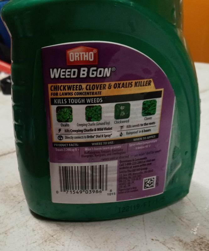 PDF U.S. EPA, Pesticide Product Label, WEED-B-GON READY SPRAY LAWN WEED ... To refill Weed-B-Gon Weed Killer Pull-N-Spray: Add entire contents of this container to the 1.33 Gal. [5 L] Weed-B-Gon Weed Killer Pull-N-Spray container. Add 160 fluid ounces of clean water (5 quarts). Reattach cap. Use according to label directions on the Weed-B-Gon Weed Killer Pull-N-Spray container. STORAGE AND DISPOSAL Ortho® Weed B-gon™ Lawn Weed Killer Concentrate | Ortho® Ortho® Weed B-gon™ Lawn Weed Killer Concentrate kills weeds to the root. When used as directed, you can kill over 250+ weeds without damaging your lawn. Ortho® Weed B-gon™ is specially designed for Northern and Southern lawns and may be applied with the Ortho® Dial 'N Spray® Hose-End Sprayer or any other tank sprayer. See results in hours! Ortho Weed B Gon Chickweed, Clover & Oxalis Killer for Lawns ... Ortho Weed B Gon Chickweed, Clover & Oxalis Killer for Lawns Concentrate is formulated to kill tough weeds in your lawn. The formula kills Ground Ivy (Creeping Charlie), Speedwell (Veronica), Wild Violet and other tough lawn weeds as listed. The concentrate may be applied with the Ortho Dial 'N Spray Hose-End Sprayer or any other tank sprayer. Ortho weed b gon plus crabgrass control - Clevermess Kills crabgrass, dandelions and other common lawn weeds.Ortho® Weed B Gon® plus Crabgrass Control Concentrate2 is guaranteed to kill crabgrass, dandelions and other listed common lawn weeds to the root! When used as directed, you can kill over 200+ weeds without damaging your lawn. Apply with the Ortho® Dial 'N Spray® Hose-End sprayer or. Apr 12, 2022 · No, Ortho Weed-B-Gon MAX Plus ...